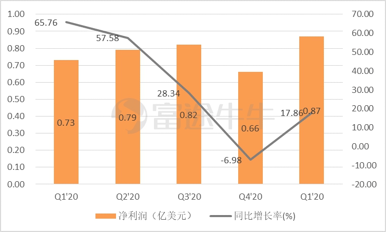 2021财年第一季度公司实现0.87亿美元的净利润,同比增长17.84%,改变了上一季度净利润负增长的状态,再次回到净利润高速增长的队列中。