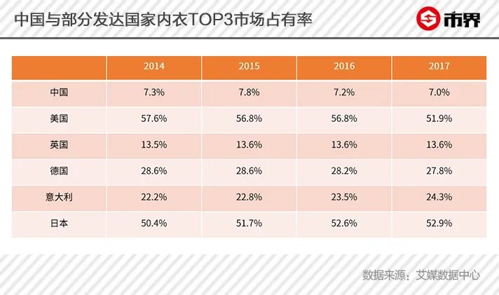 成熟的发达国家市场,内衣TOP3市场占有率较高,日本和美国前三大内衣企业市场占有率曾一度超过50%。