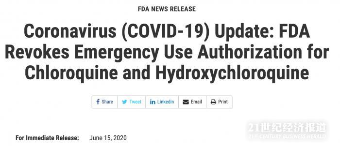 FDA在公告中称,根据对EUA的持续分析和新兴的科学数据,FDA确定氯喹和羟氯喹不太可能有效治疗COVID-19。另外,鉴于持续的严重心脏不良事件和其他潜在的严重副作用,氯喹和羟氯喹的已知和潜在益处不再超过授权使用的已知和潜在风险。这是签发EUA的法定标准。