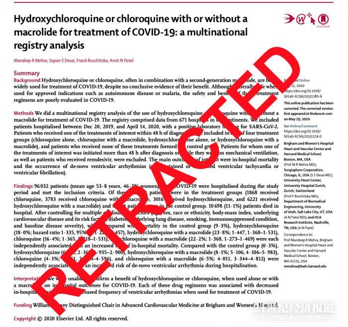 二者最近的一次大风波来自于医学顶刊《柳叶刀》(The Lancet)撤稿事件。5月22日,柳叶刀在线发表一项大规模观察性研究。研究发现,在COVID-19住院患者中,使用氯喹或羟氯喹与死亡率及心律不齐发生的增加有关。作者建议,不应在临床试验之外将这些药物方案用于治疗COVID-19。