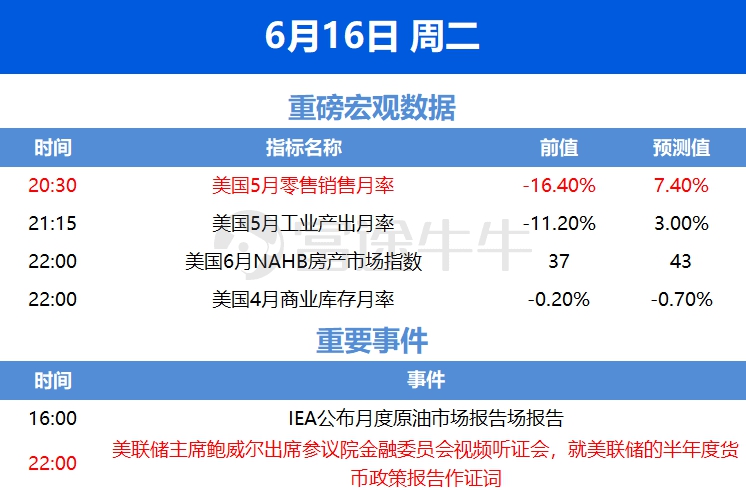 周二,数据方面关注美国5月零售销售,预测将从-16.40%大幅反弹至7.40%。如果二次疫情的担忧持续,优异的数据可能也会像这周一样被市场无视。消费是美国经济成长的最大动力,市场人士以此作为观察经济复苏进度的一个重要窗口。