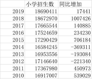 不过,需要警惕的是,2019年全国小学招生人数仅比2018年增长17441人,而2018年比2017年则增长超过百万人。尽管近年来小学招生人数变化波动较大,但增速下降如此之大仍可谓震荡。