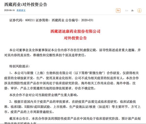 西藏药业今天公告,与斯微(上海)生物科技有限公司缔结独家战略合作。公司将通过向斯微生物支付新冠疫苗产品、结核疫苗及流感疫苗产品合作对价,获得上述产品全球独家开发、注册、生产、使用及商业化权利。