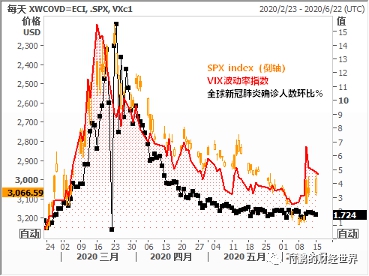 我们在观察疫情对于美国的冲击或者对于全球大力自然冲击的时候,我们仍然关注的是金融市场对于这个一阶导的反馈,上图就是我用于对于疫情和金融性资产冲击观察的数据组,它是全球相关肺炎确诊人数的环比增速和标普以及VIX波动率之间的关系,图上可以看到这个增速在疫情全球传播的2月份起来,3月中旬达到高潮,然后逐步增速消退,全球风险性资产和波动率基本是跟随着这个一阶导在进行着波动。