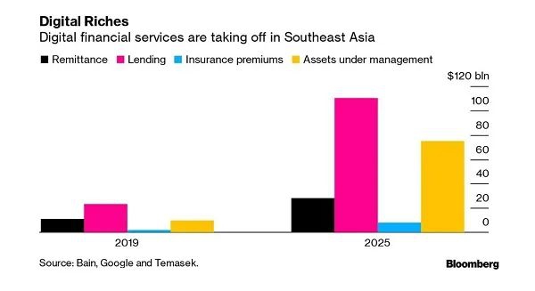 这里从两个角度看,一个是行业趋势。由贝恩资本、谷歌、淡马锡联合发布的数据,图中粉色部分代表的东南亚地区贷款业务的预期增长规模最大,当地中小企业小额贷款需求持续旺盛。互联网公司进入这个领域本身具备大数据风控上的优势。