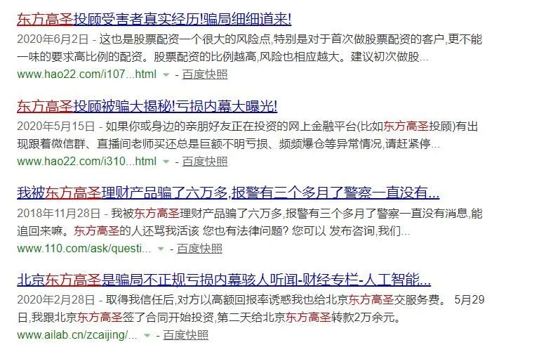 用户关于东方高圣投资公司的投诉,层出不穷。在百度上,多位购买服务费的用户讲述了自己被套的经历。值得注意的是,该公司客服并未询问记者的证券投资相关情况,在交流过程中,也发过多张高收益的截图。