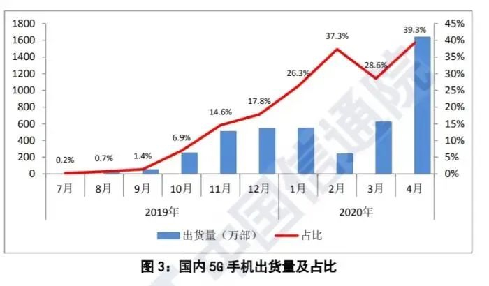 中国信通院的数据显示,2020年1-4月,国内市场5G手机累计出货量3044.1万部、上市新机型累计65款,占比分别为33.6%和47.4%。