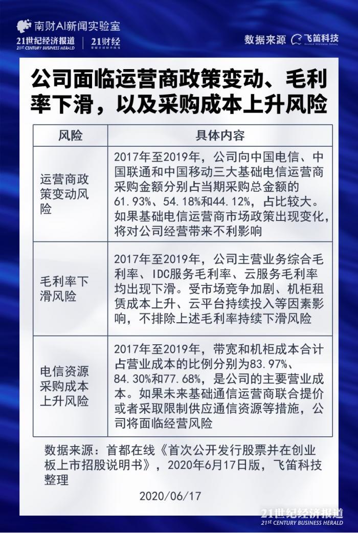 首都在线于6月17日发布的招股说明书中共提示了多个风险点。经南财AI新闻实验室梳理,发现有三大风险点跟公司经营高度相关,分别是运营商政策变动风险、毛利率下滑风险、电信资源采购成本上升风险。