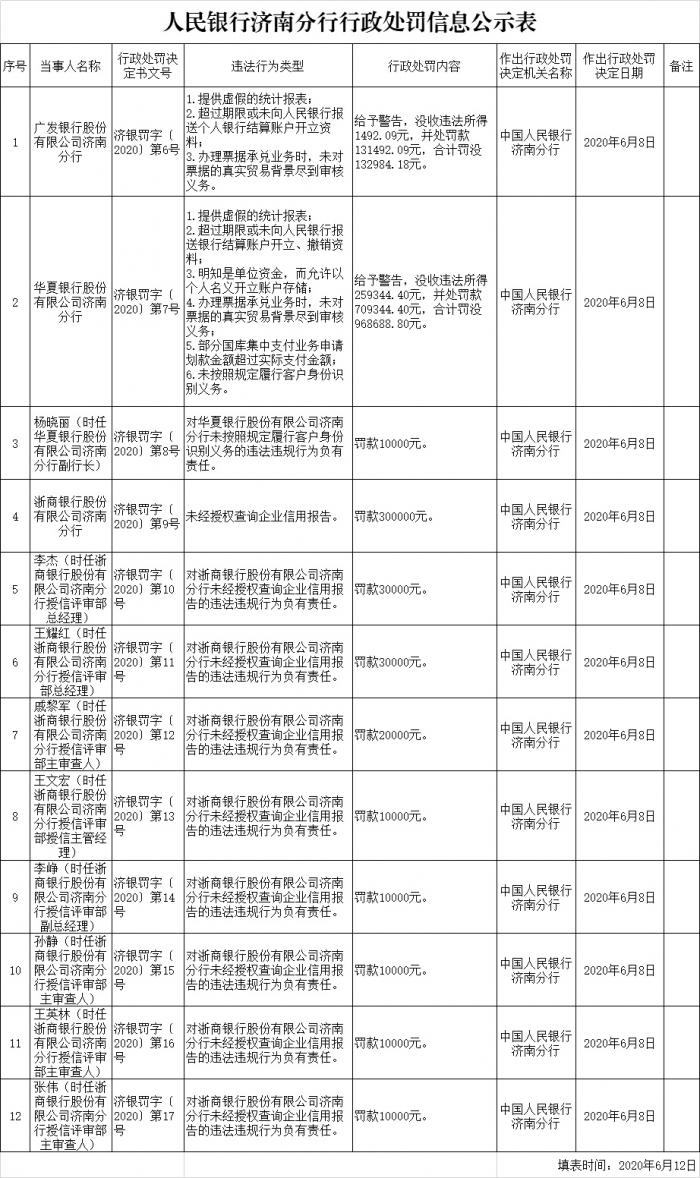 中国人民银行济南分行今日公布的人民银行济南分行行政处罚信息公示表显示,华夏银行股份有限公司济南分行存在提供虚假的统计报表;超过期限或未向人民银行报送银行结算账户开立、撤销资料;明知是单位资金,而允许以个人名义开立账户存储;办理票据承兑业务时,未对票据的真实贸易背景尽到审核义务;部分国库集中支付业务申请划款金额超过实际支付金额;未按照规定履行客户身份识别义务六宗违法违规行为。