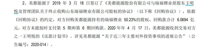 正如上证报所料,并购标的盈利能力很差,收购之后难以完成高额的业绩对赌。2019年3月,公司终止收购瑞福锂业,并约定由交易对方(瑞福锂业原股东)分8笔向上市公司支付50.23%的股权回购款,然而,截止到目前上述款项仍未支付完毕。