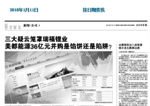 2018年1月份,上证报刊发了《三大疑云笼罩瑞福锂业 美都能源36亿元并购是馅饼还是陷阱?》的深度调查。大量的一手调查内容经本报披露后,监管层多次向公司下发问询函。