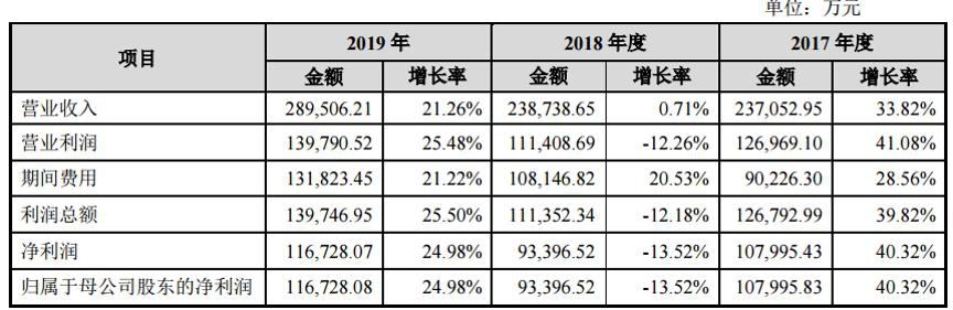 2017-2019年,甘李药业营业收入分别约为23.71亿元、23.87亿元、28.95亿元,分别较上年同期增长33.82%、0.71%和21.26%。