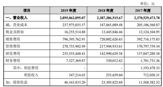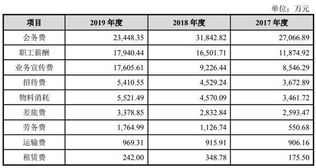 招股书显示,2017-2019年,公司的销售费用分别为5.93亿元、7.2亿元和7.96亿元,分别占当期营收比例25%、30.16%和27.51%。