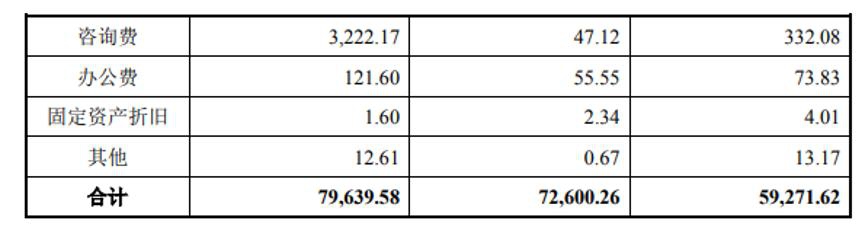 虽然2019年公司会务费有所降低,但期内咨询费却出现激增。2017-2019年,公司咨询费分别为332.08万元、47.12万元以及3222.17万元。