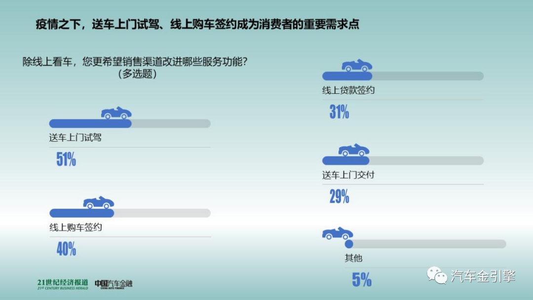 数字化、新渠道和用户体验成为了新环境下汽车行业的发展方向。受疫情的影响,经销商不复工+消费者不出门,带来了线上直播的热潮,大家纷纷运用新兴直播平台进行线上营销。在调查中,我们发现,送车上门试驾、线上购车签约成为消费者的重要需求点。在线看车与送车上门提供试驾服务相结合的方式,或许可为厂商提供了新的销售思路。