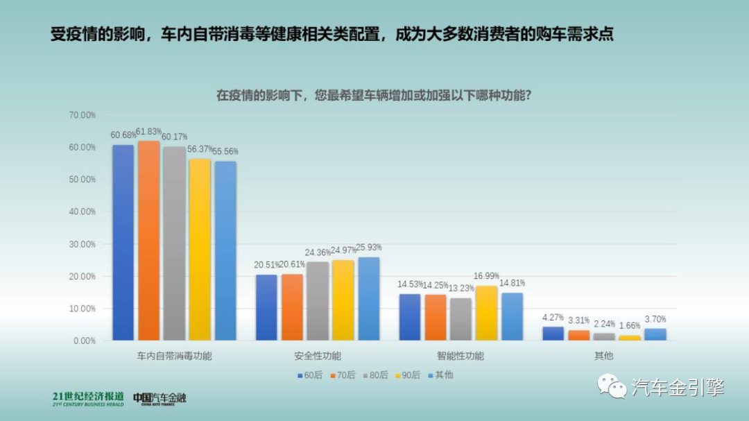 调查还显示,受疫情的影响,车内自带消毒等健康相关类配置,成为大多数消费者的购车需求点。对此,不少汽车厂家开始将健康理念融入到产品的研发中,增加健康相关类配置,如空气消毒净化功能,体温、心率监测等健康功能。