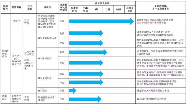 而那个唯一上市的新药,就是“艾可宁”。该药于2018年5月获得国家药监局颁发的新药证书,2018年8月起开始在中国销售。公司认为,艾可宁打破了国外药企对抗艾滋病新药的垄断,建立了中国在该领域的创新能力。
