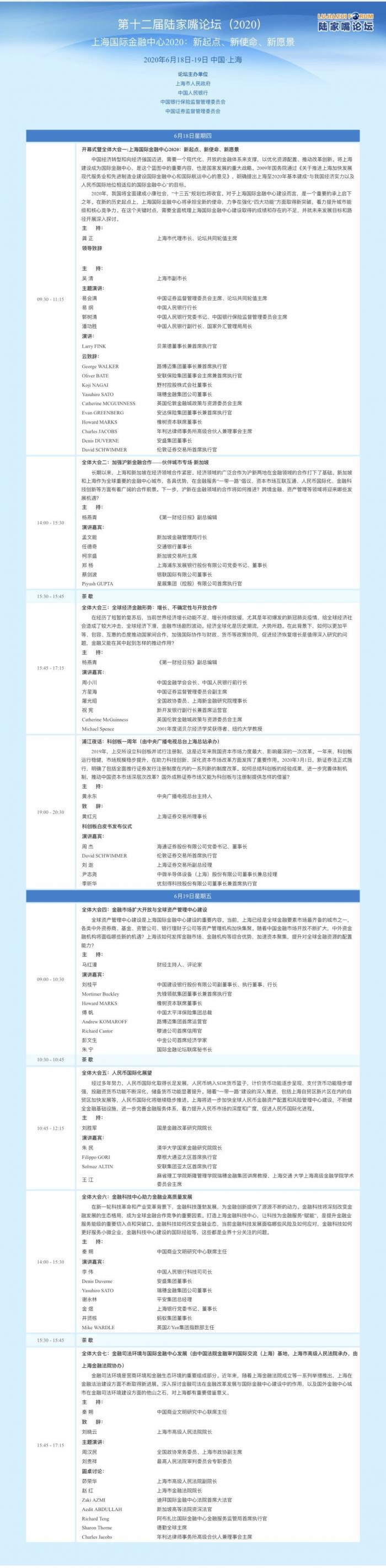 6月18日上午9时30分,第十二届陆家嘴论坛将在上海开幕,本届陆家嘴论坛由中国证监会主席易会满与上海市代市长龚正担任共同轮值主席,主题为“上海国际金融中心2020:新起点、新使命、新愿景”。