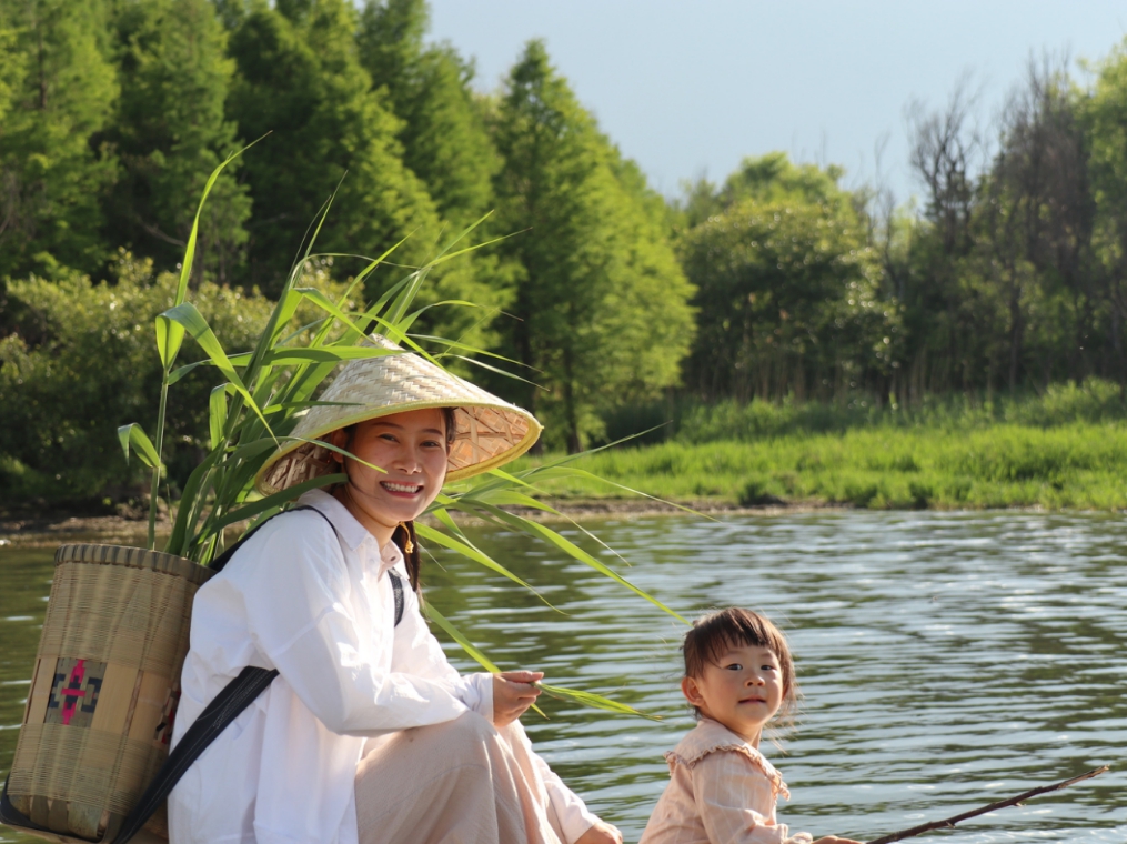 老颜夫妇与女儿在丽江边玩耍