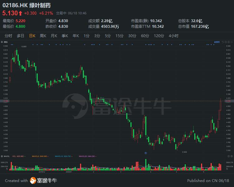 富途资讯6月18日消息,绿叶制药近三日股价持续走强,累涨超23%,现涨6.21%,报5.13港元,暂成交2.28亿港元,最新总市值167亿港元。