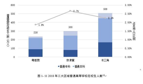 其中,长三角地区高校在校生数在三大区域中排名第一,共有508万人,占长三角地区总人口2.3%,与全国该比例(2.2%)较为接近;京津冀有300万高校在校生,占本地区总人口2.7%;粤港澳地区高校在校生数238万人,占本地区人口1.9%。三大区域中只有粤港澳地区高校在校生占本地人口比例低于全国平均水平。
