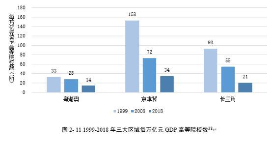 1999年至2018年,三大区域每万亿元GDP高等院校数下降明显,说明高等院校数量的增长滞后于各地区的经济发展。2018年粤港澳地区每万亿元GDP高等院校数仅为14所,远少于京津冀(34所)和长三角地区(21所)。