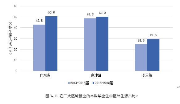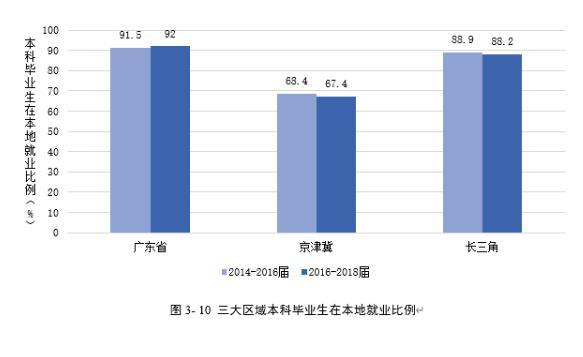 从2014届至2018届毕业生的就业去向来看,广东省、长三角地区的本科毕业生在本地区就业的比例都比较高。