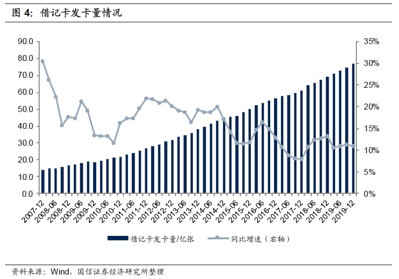 借记卡产业走向成熟,发卡量增速放缓。2019年末,我国借记卡在用发卡量达到76.7亿张,同比增长11%,占银行卡发卡量总数的91%。2015年以来我国借记卡发卡量增速不断下降,近几年一直在10%左右。借记卡发卡量进入低速增长阶段,标志着借记卡的发卡市场已经成熟。