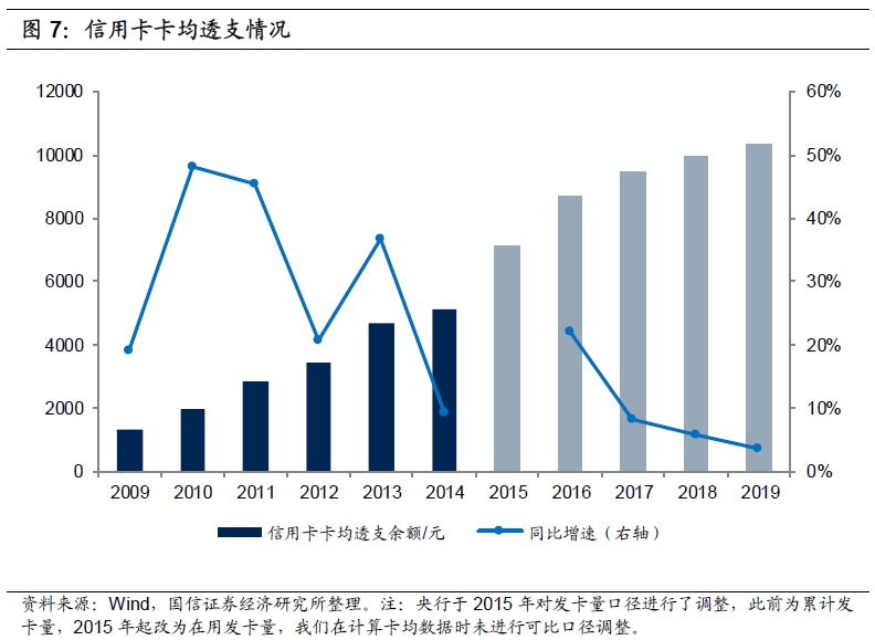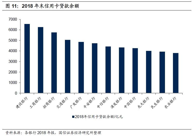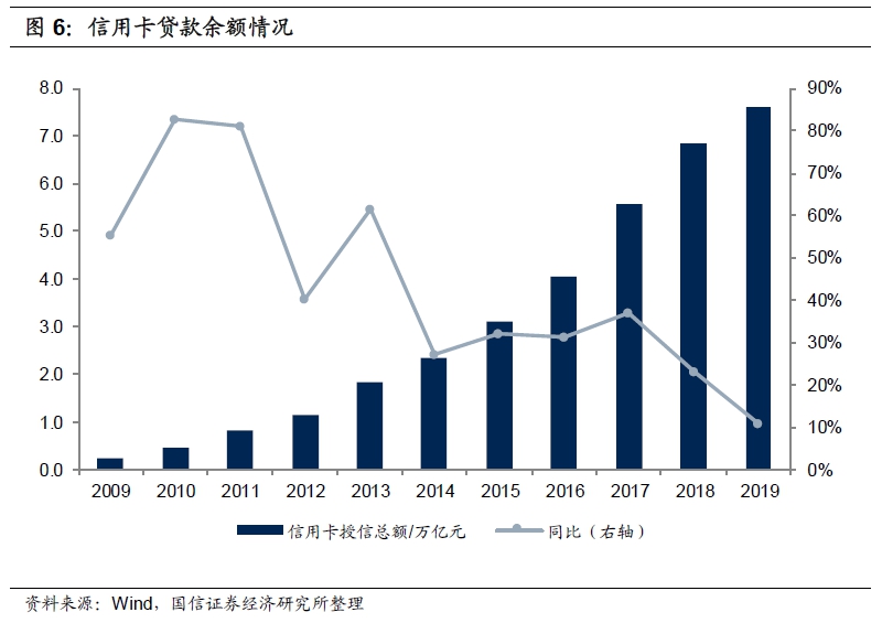 信用卡除了发卡量之外,还有贷款余额值得关注。2019年末,我国信用卡贷款总额达到7.6万亿元,同比增长11%,相当于卡均透支余额约1.0万元。信用卡贷款余额增速在2018年之前都快速增长,但2019年以来增速也开始回落。此外,随着信用卡市场走向成熟,卡均透支余额也在下降,意味着用户对信用卡透支的需求已步入平稳。