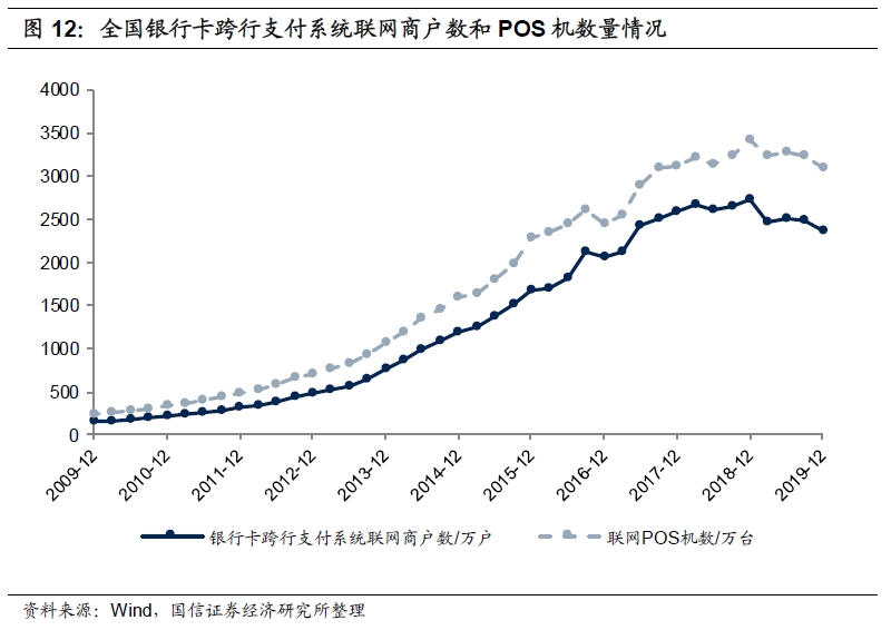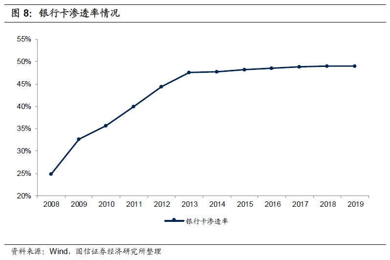 银行卡渗透率接近一半,近几年都保持稳定。我国银行卡渗透率(指剔除房地产、大宗批发等交易类型,银行卡消费金额占社会消费品零售总额的比例)在2008-2013年快速增长,2013年渗透率达到48%,之后银行卡渗透率进入平稳阶段,2019年末为49%。从银行卡渗透率的发展趋势来看,我国银行卡刷卡消费额很难再快速增长。