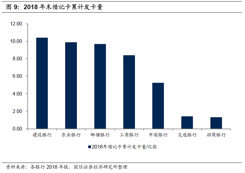 (4)发卡机构获得发卡服务费。但对发卡机构来讲,这部分服务费收入占总收入的比重并不高,发卡机构还可以通过发卡获得其他收入,如银行卡年费等,但更为重要的则是通过发卡获得基础客户,进而带来活期存款沉淀、销售理财产品等衍生收入;而信用卡则主要是为了获得透支和分期业务利息收入(分期手续费也视为利息收入)。