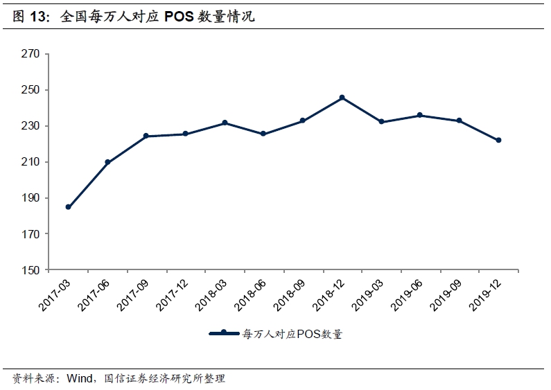 截至2019年末,全国银行卡跨行支付系统联网商户约2363万户,联网POS机3089万台。但不管是联网商户数还是POS机数量,在2019年都是负增长。而每万人对应POS数量自2019年四季度也开始负增长,意味着整个银行卡刷卡消费的收单市场已经进入成熟期。