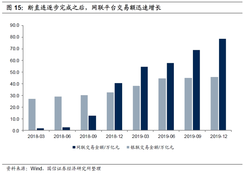 此外,随着第三方支付的兴起,支付公司通过在多家银行开立账户,曾经一度实现了类似跨行清算的功能,市场上曾质疑其无证经营清算业务。为杜绝这一风险,人行于2017年1月发布了《关于实施支付机构客户备付金集中存管有关事项的通知》,逐步切断了支付公司与银行的“直连”,并成立了网联清算有限公司完成互联网支付中涉及的跨行清算。目前网联也从事类似的清算业务,且交易金额较大。