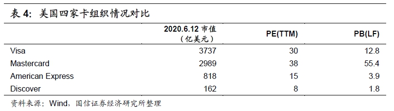 JCB、中国银联均未披露过年报,因此我们接下来通过美国这四家公司来进一步观察卡组织的经营情况。从所披露的数据来看,各家卡组织盈利能力都非常强,ROE很高,其股票也交易在一个相对较高的估值水平,足可见这是一门非常不错的生意。
