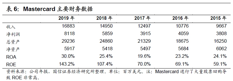 Mastercard同样提供全球支付网络服务,其于2019年实现营业收入169亿美元,其中111亿美元来自非北美市场。其收入也基本都来自银行卡相关手续费。