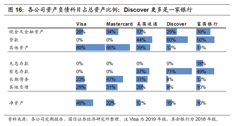 由于自发银行卡,因此美国运通的利息净收入占比相对更高。美国运通于2019年实现营业收入436亿美元,其中利息净收入占比20%;2019年末信用卡贷款余额约870亿美元,占总资产的44%。