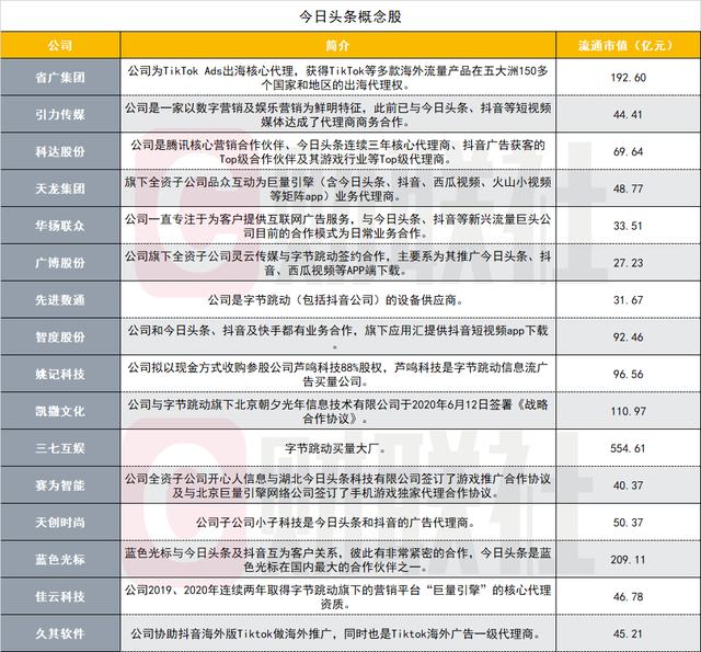 近期有多家公司宣布了与抖音等的合作后,股价迎来爆炒,有媒体整理出一份今日头条概念股清单。
