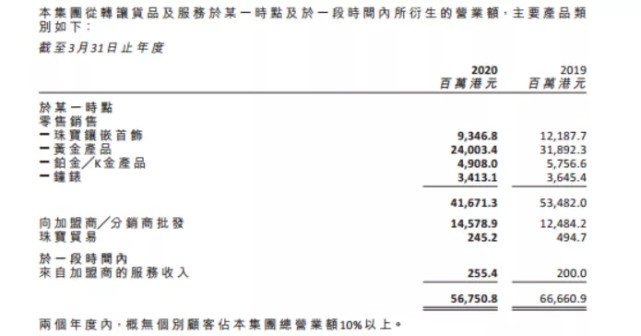 分业务来看,超67%的营收来自自营门店的黄金和珠宝镶嵌首饰收入,15.5%来自对加盟商的批发收入,9.2%来自铂金/K金销售收入,5.8%来自高端钟表代理销售收入。