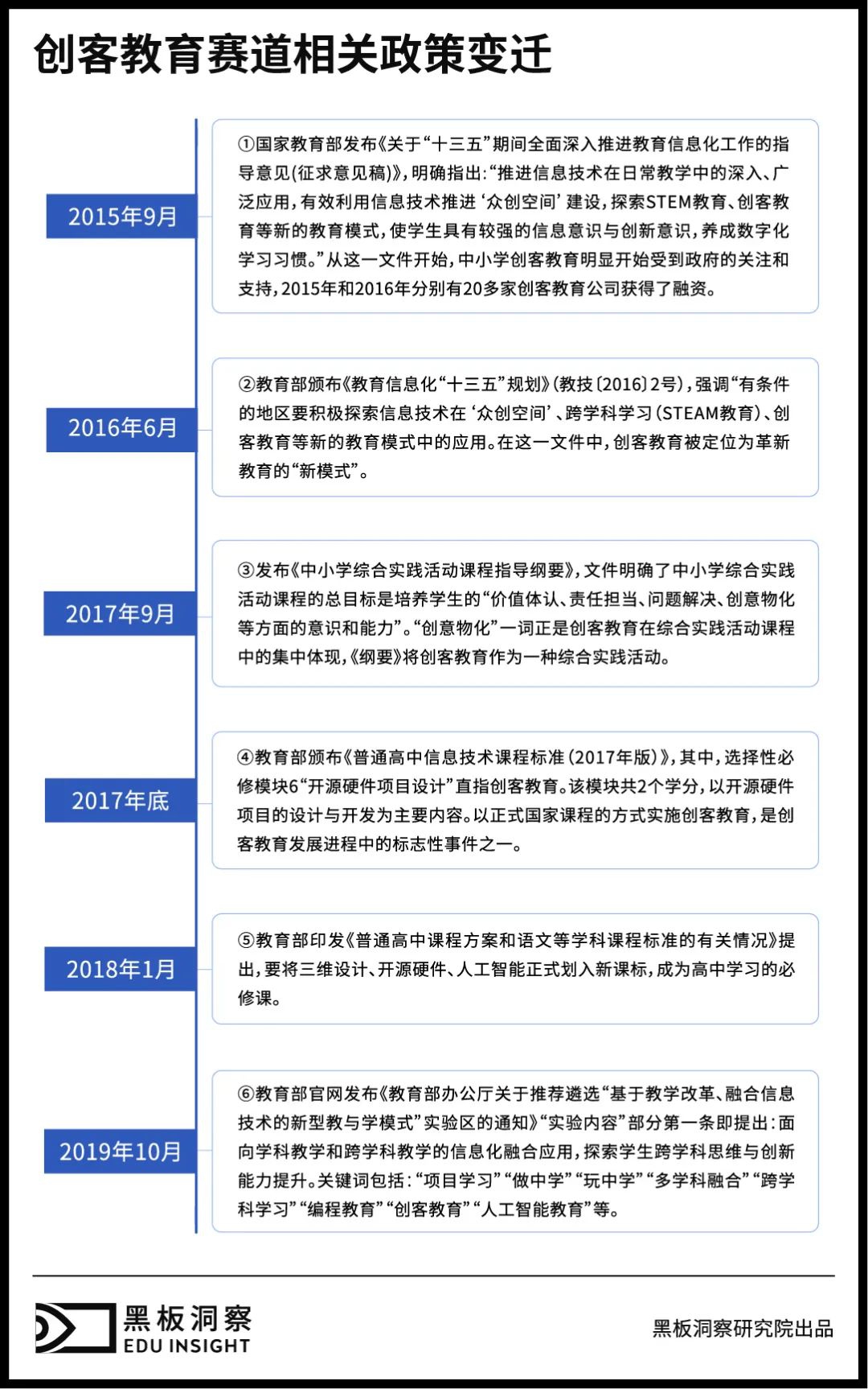 黑板洞察梳理了国内近五年来对创客教育较有影响力的政策,基本可以从中看到创客教育在中国的发展历程。