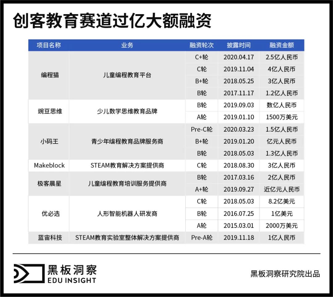 黑板洞察选取了146家创客教育公司进行了分析统计。146家公司中,有2家在新三板上市,另有83家获得融资。创客教育赛道过亿大额融资发生16起,其中编程猫4次融资过亿,优必选和小码王3次融资过亿,优必选C轮达到8.2亿美元。