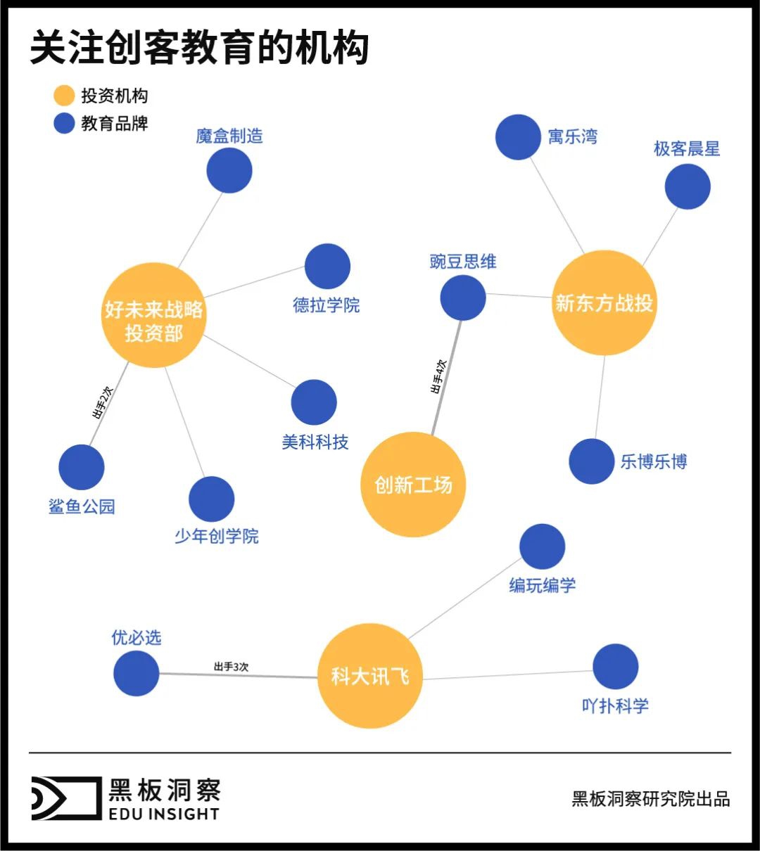 在上述统计中,黑板洞察同时梳理出了出手次数大于2的投资机构。其中好未来战略投资部、新东方战投、创新工场、科大讯飞出手次数大于4次。