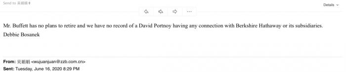 对此,黛比‧波萨涅克( Debbie Bosanek)昨天夜间回应中证君说,“巴菲特先生并没有退休计划,我们的记录显示,伯克希尔哈撒韦和子公司与这位大卫.波特诺伊没有任何关系”。