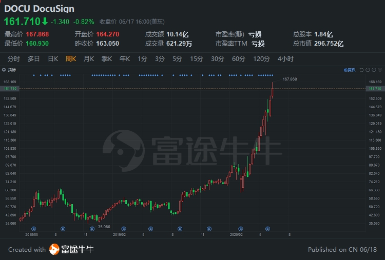 DocuSign2018年在纳斯达克完成上市,上市两年来其股价已经翻四倍。因股价持续表现较好,纳斯达克方面宣布DocuSign将取代美联航空成为纳斯达克100指数成分股,于6月22日正式加入该指数。