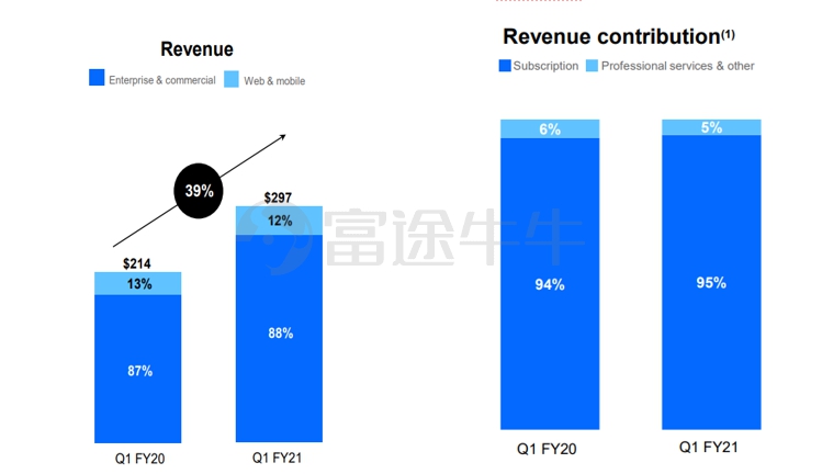 DocuSign在2021Q1中实现营业收入2.97亿美元,同比增长39%。其中,订阅收入达2.809亿美元,同比增长39%,占总收入的95%,是DocuSign的主要收入来源。随着协议云的发展,DOCU预计订阅收入的比例将进一步提高,而专业服务收入的贡献可能会下降。