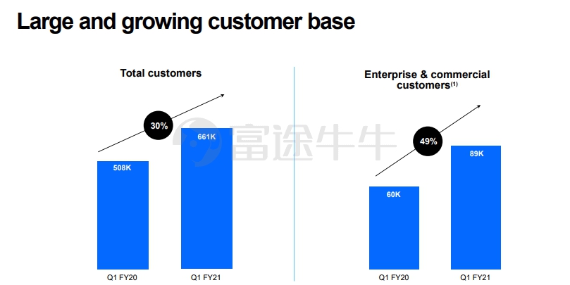 非财务指标进一步反映了公司的高增长趋势。2021财年Q1公司总用户数增长了30%,其中企业和商业用户数增长49%,约占用户总量的13.46%,是公司着力发展的客户群体。快速增长的用户群体为公司的业绩增长提供了稳定支持。DOCU的目标是专注于商业和企业客户群。在2020财年,这些客户群创造了超过80%的增量收入。