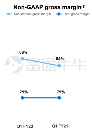 2021财年第一季度该公司的GAAP毛利率为75%,而去年同期为76%。在Non-GAAP标准下,公司业务整体毛利率与去年同期相比没有发生变化,均为79%。单看公司的核心业务——订阅服务的话,可以发现订阅服务的毛利率有所降低,从86%降低到84%,但是依然保持在较高的水平。