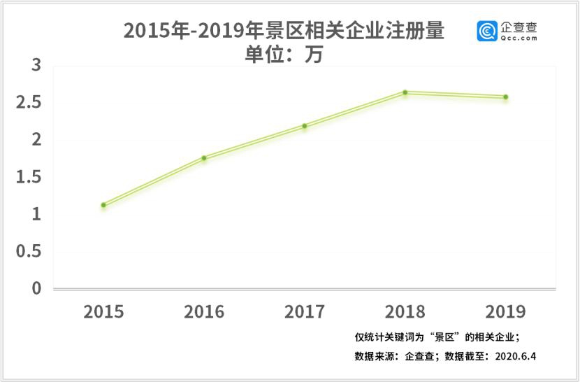 从景区相关企业的注册量来看,2015年以来的五年之间,景区相关企业注册量整体呈上升趋势,2016年在五年中增速最快,当年共新增1.76万家,同比增长55.8%。2018年相关企业增长量达到最高,为2.64万家。2019年景区相关企业的注册量为2.58万家。