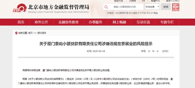据北京金融监管局介绍,象屿小贷未取得所在省和北京市小贷公司在京开展业务的资质,涉嫌违规在京经营小额贷款业务。为保护社会公众的合法权益,北京金融监管局向社会郑重提示,外省市小贷公司未经所在省市金融监管部门批准不得在京跨区域经营!