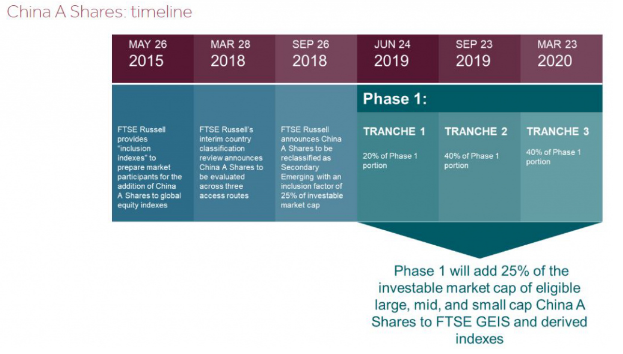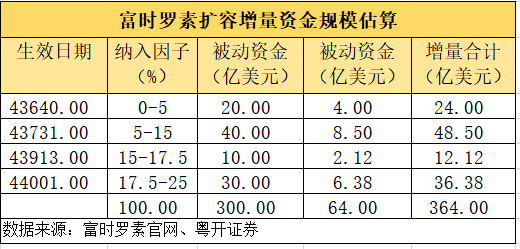按照计划,富时罗素纳入A股第一阶段分3步走完,2019年6月首次以5%的纳入因子纳入A股,2019年9月将纳入因子提升至15%,今年3月份提升至25%。
