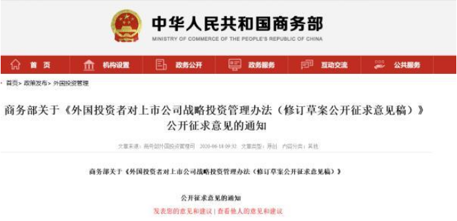 6月18日,商务部发布《外国投资者对上市公司战略投资管理办法(修订草案公开征求意见稿)》(以下简称《战投办法》),该文件为商务部、国资委、税务总局、市场监管总局、证监会、外汇局等6部门对《战投办法》进行的全面修订。